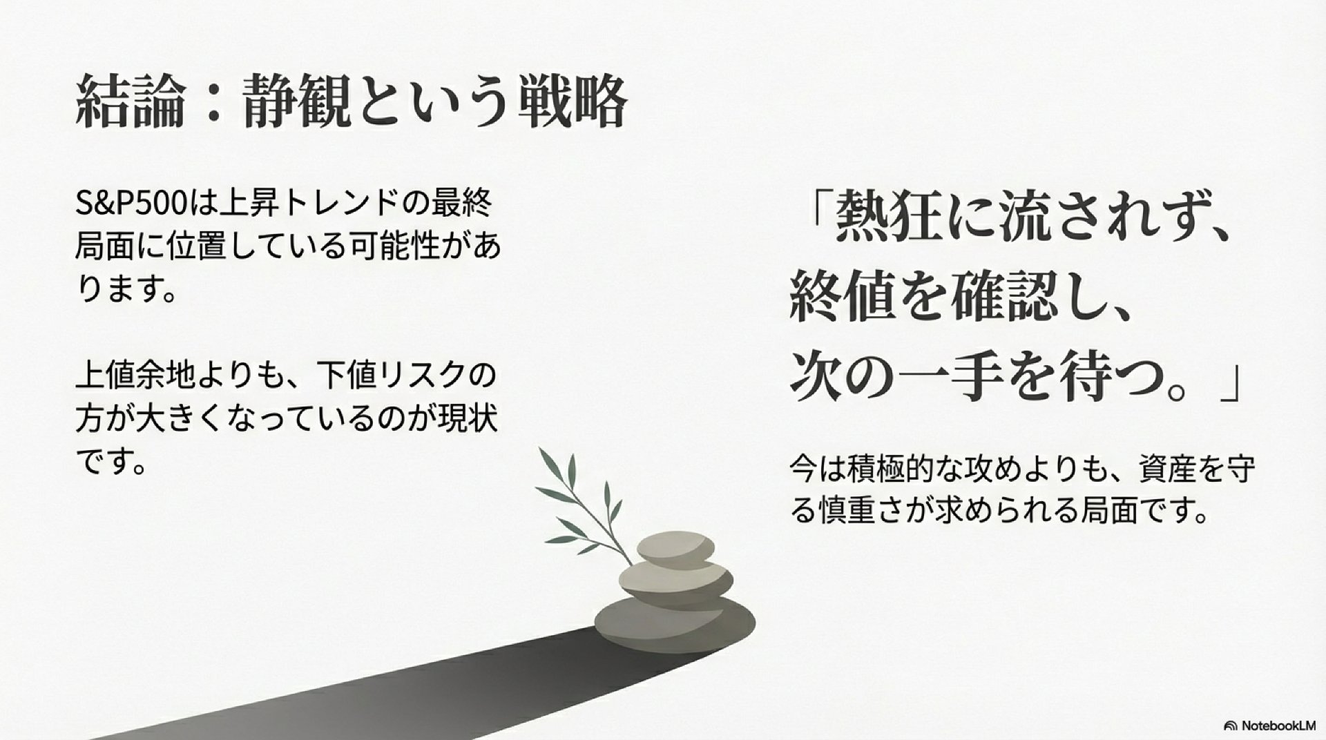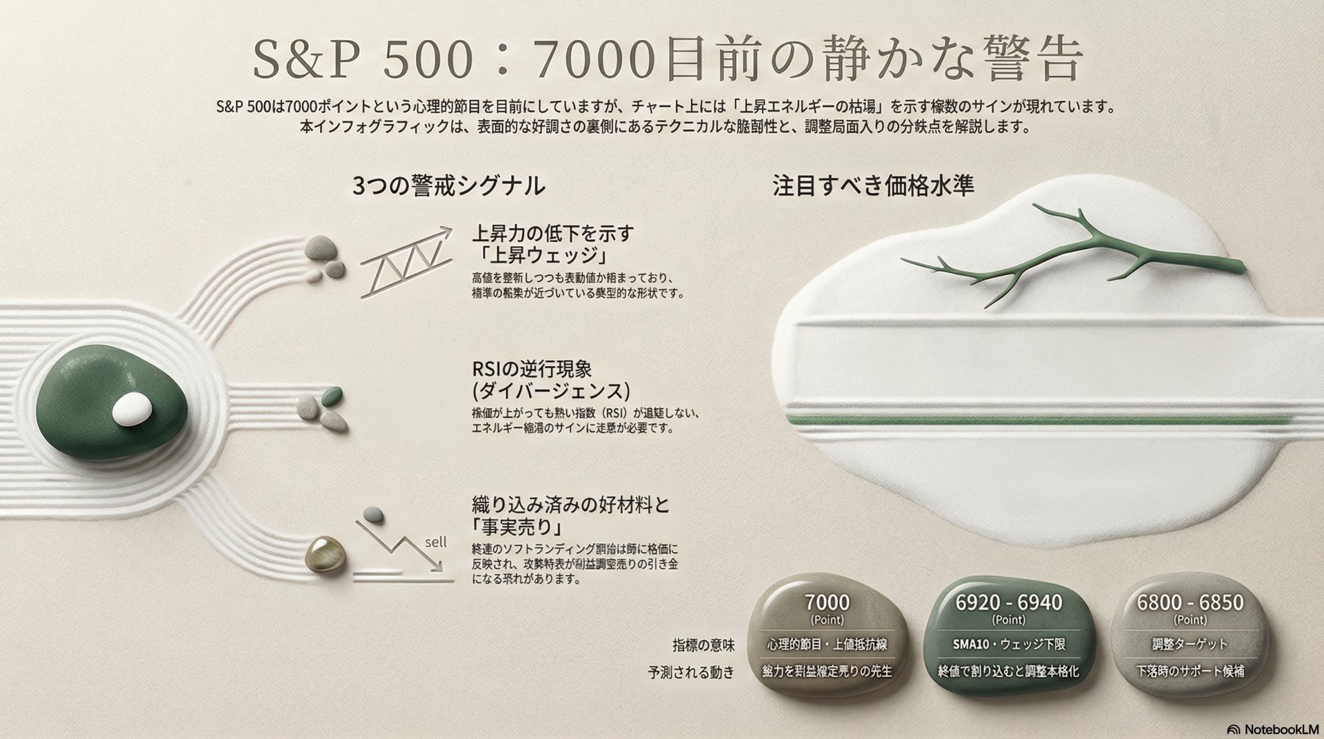 本記事では、現在のS&P500チャートに潜む3つの警戒すべきサインを、専門用語を避けながら分かりやすく解説します。