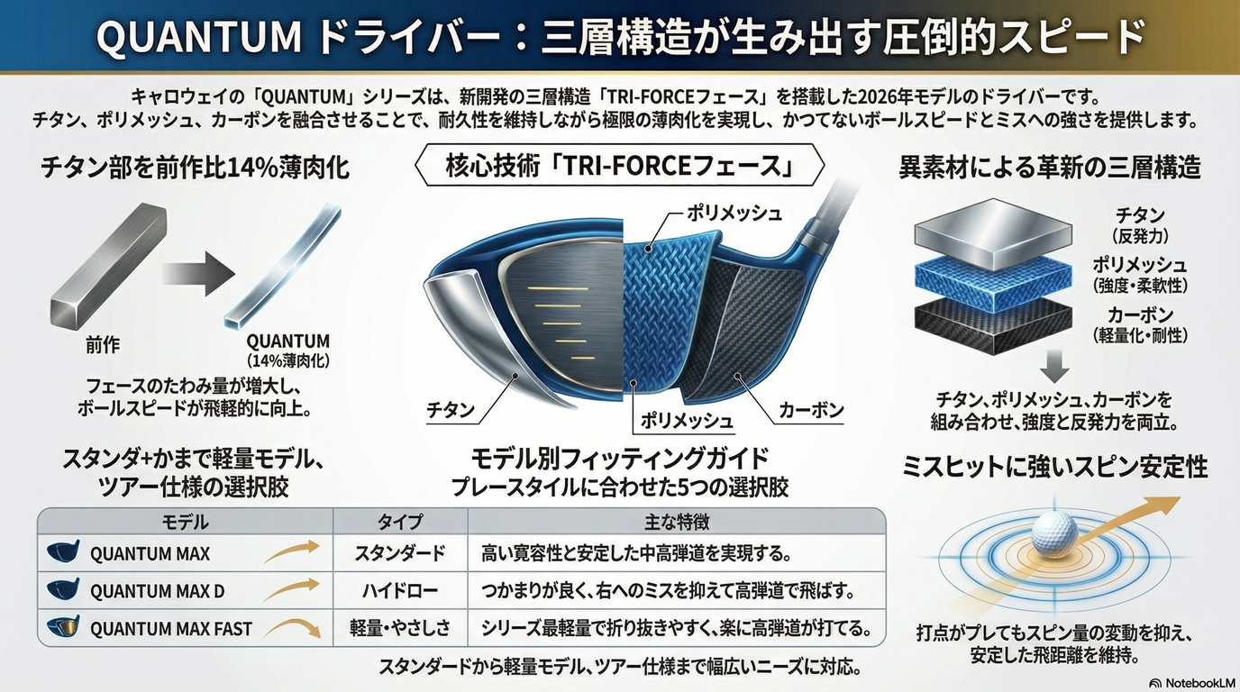 キャロウェイQUANTUMドライバーは、チタンとカーボンという異素材を融合させる革新的なアプローチによって、これまで不可能とされてきたフェースの薄肉化を実現し、ボールスピードとスピン安定性というドライバーに求められる性能を新たな次元へと引き上げました。