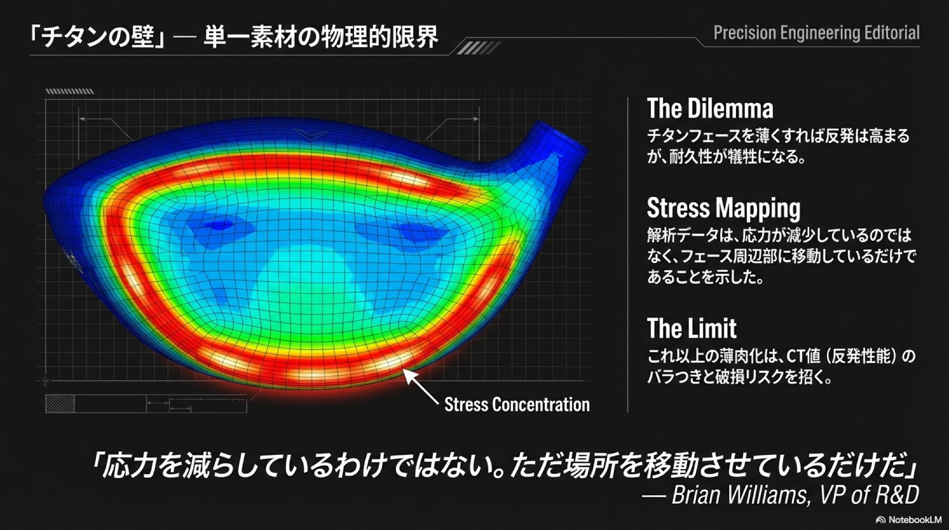 ドライバーのフェース開発において、エンジニアは常にチタンの薄肉化による反発性能向上という課題と戦ってきました。しかし、そのアプローチは限界に達しつつありました。単にチタンを薄くするだけでは耐久性が犠牲になり、インパクト時の応力(ストレス)が別の場所に移動するだけで、根本的な問題解決にはならなかったのです。