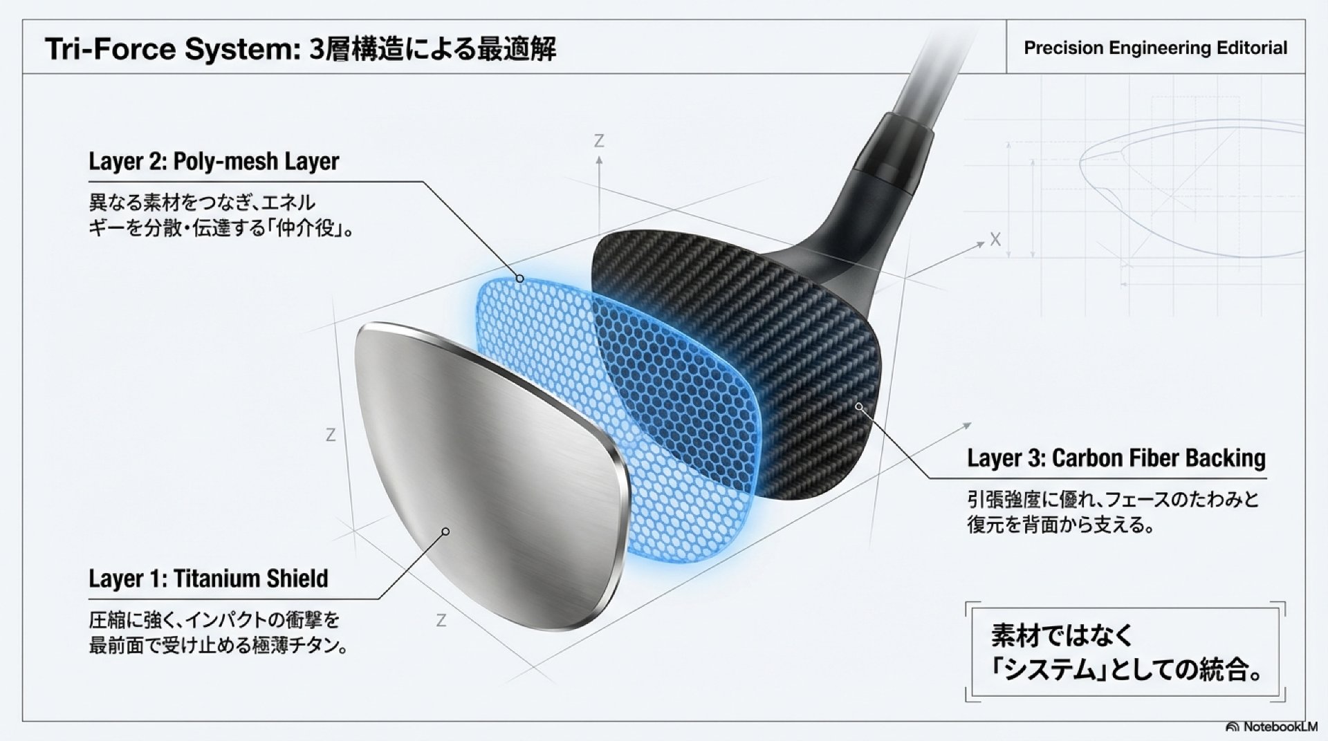 この壁を打ち破るため、2026年の「QUANTUM」ドライバーでキャロウェイが提示した答えが「トライフォース・フェース」でした。これは、チタン、ポリメッシュ、カーボンファイバーという3つの異なる素材を組み合わせた画期的な3層構造のフェースです。