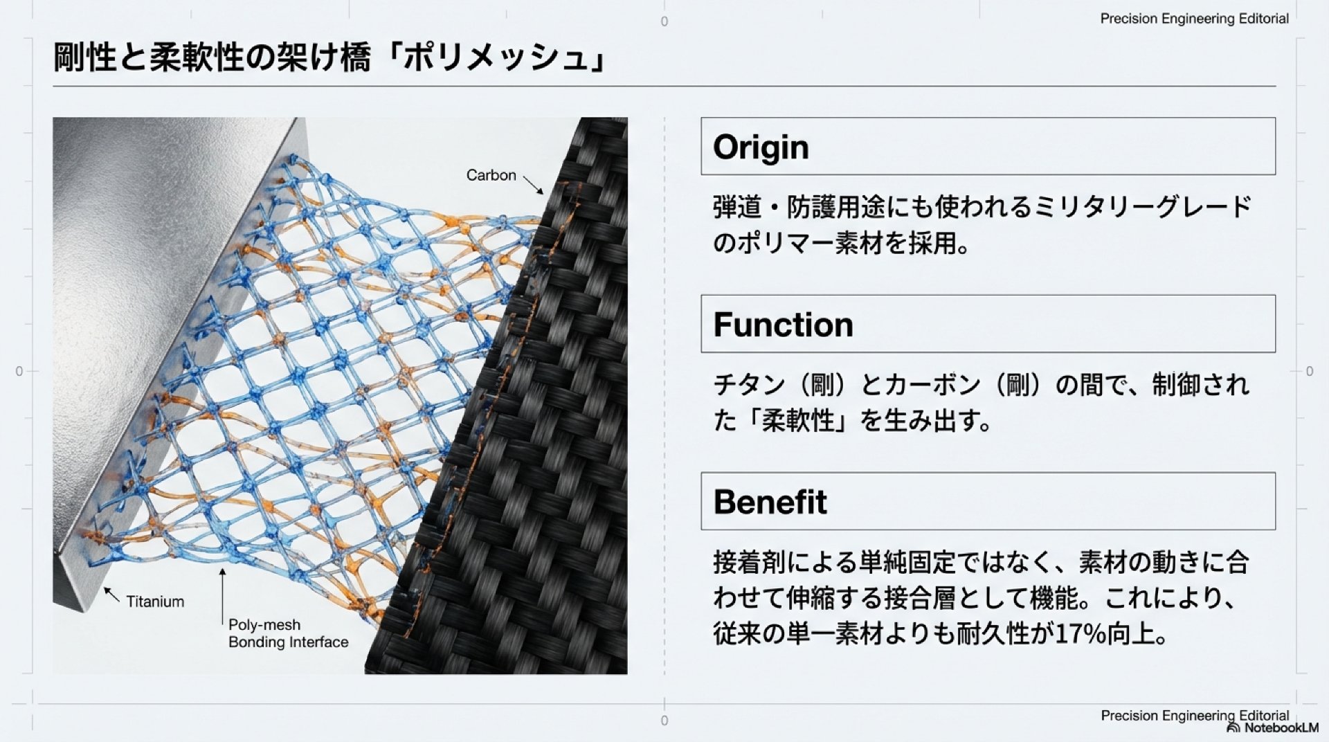 - ポリメッシュ: もともと軍事的な防護用途で開発されたミリタリーグレードのポリマー素材。柔軟な中間層として、剛性の異なるチタンとカーボンがシステムとして機能できるよう、その動きをつなぎながら制御する。