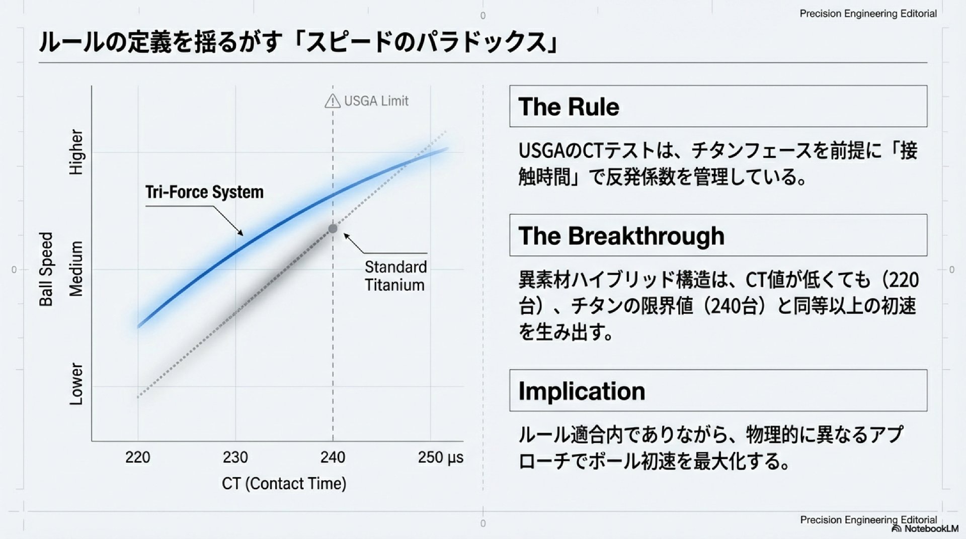 これは単なる素材の変更ではありません。設計思想の根本的な転換です。この瞬間こそ、「重量削減」がチタンそのものの強度よりも価値のある設計通貨となり、現代のあらゆるドライバー設計を支配する原則が確立された瞬間だったのです。