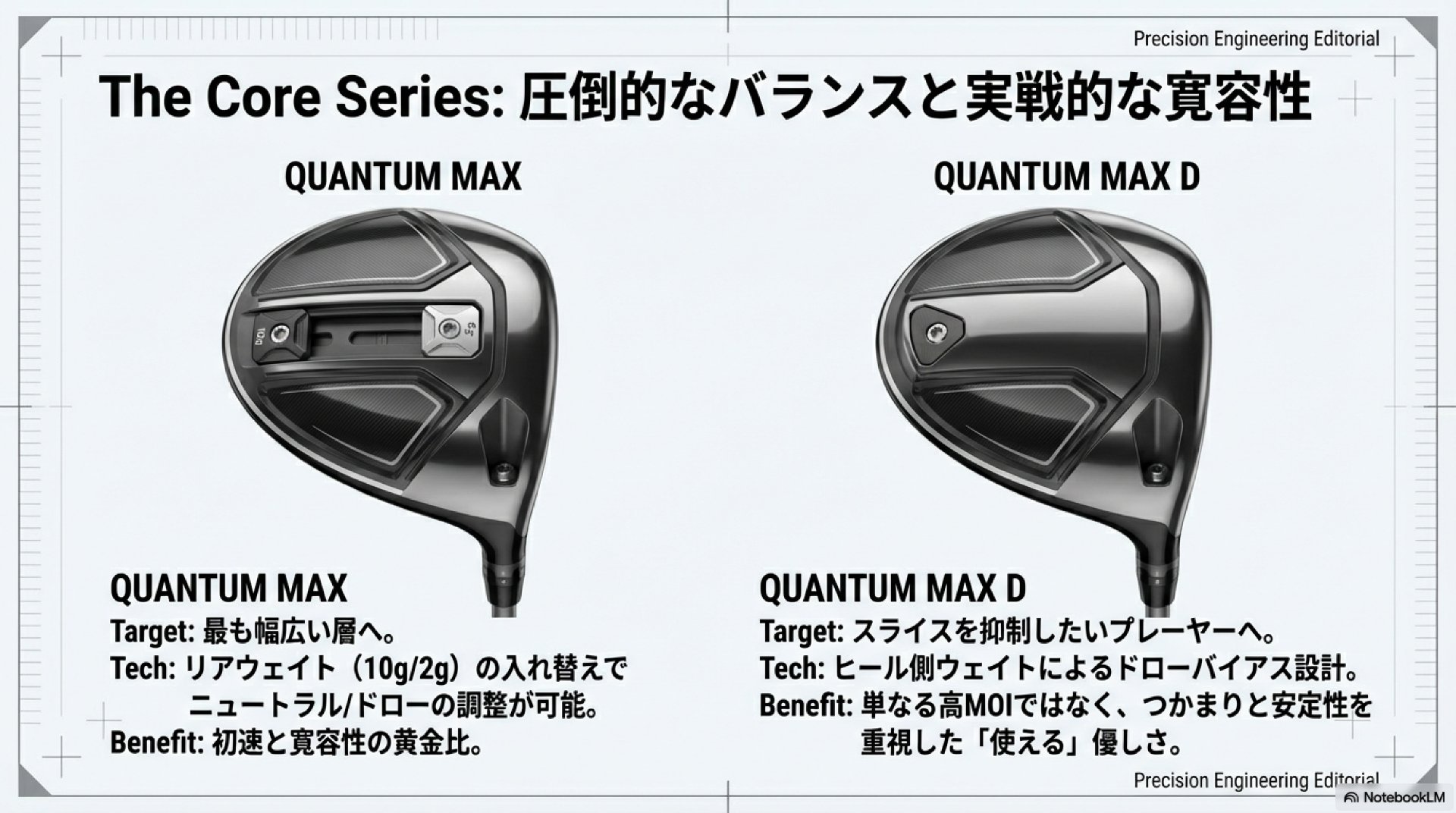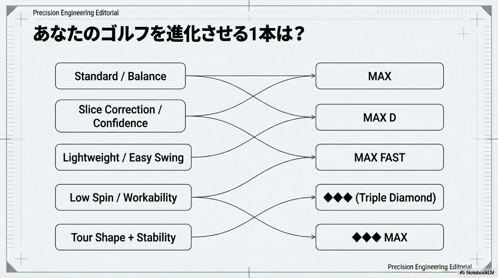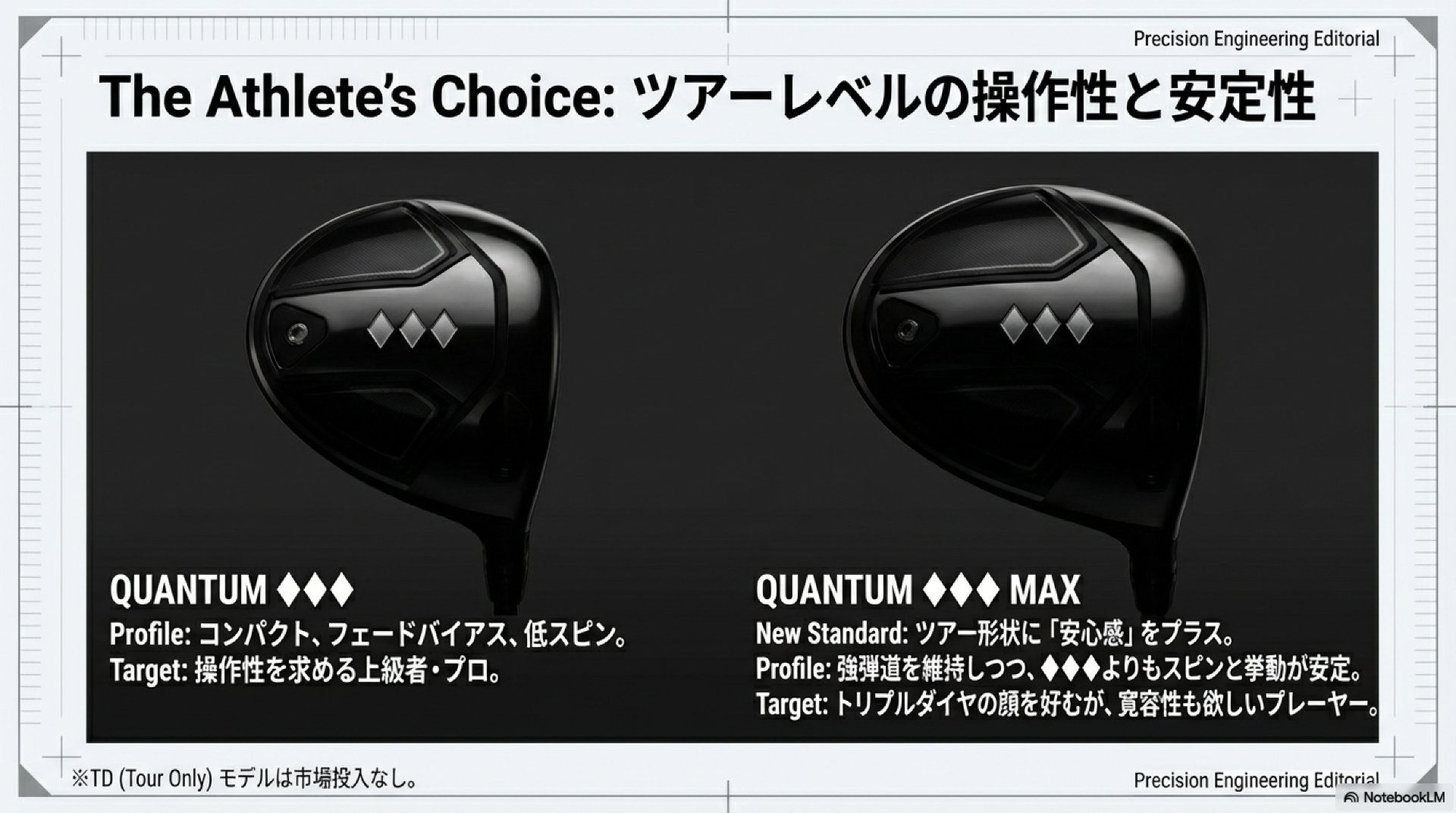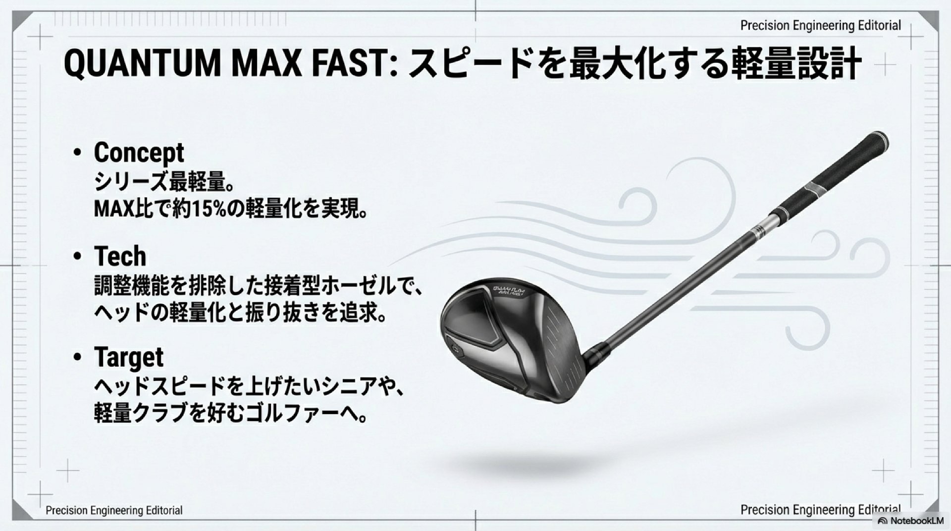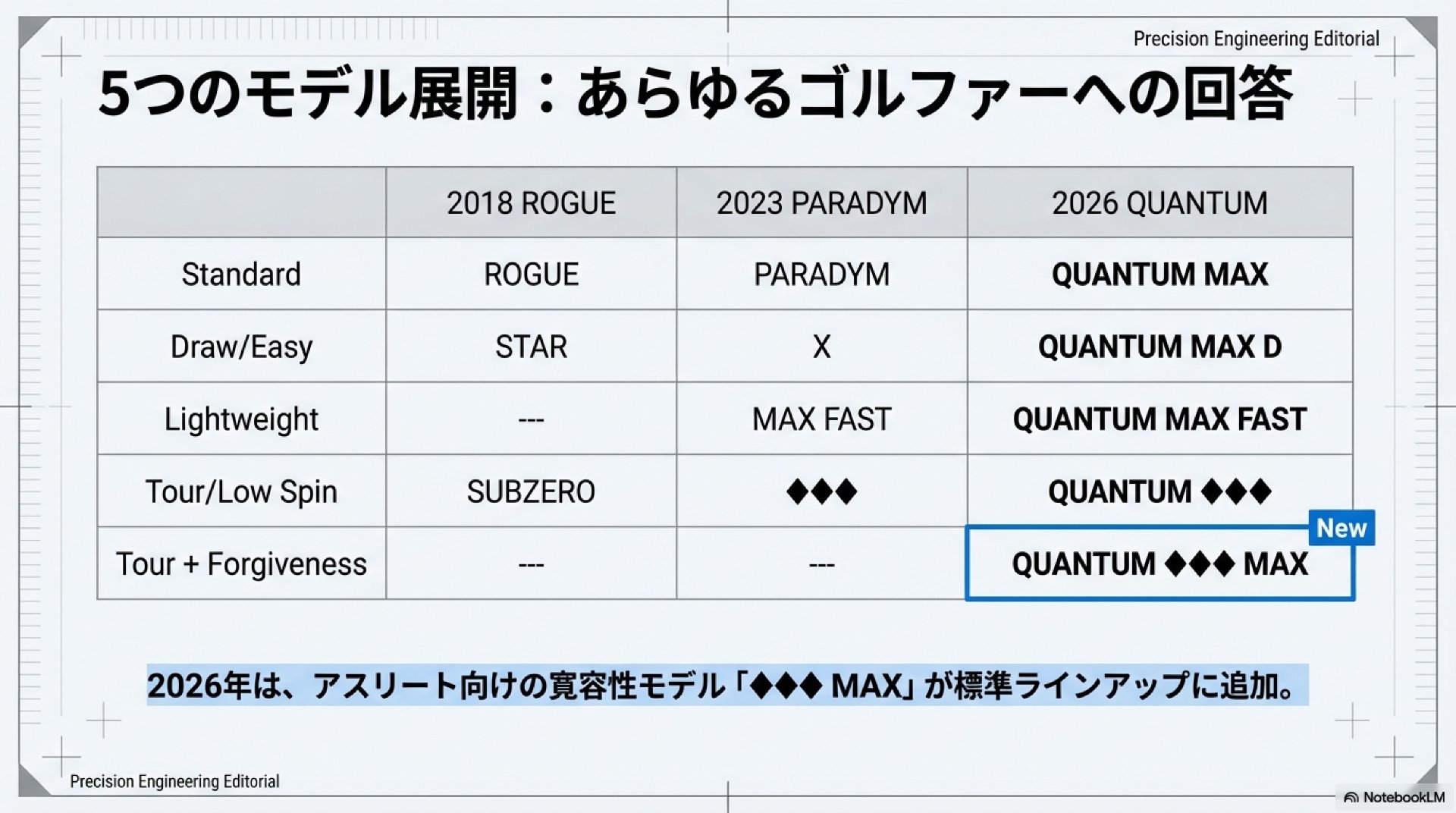 そして、その傾向はさらに加速します。2026年の「QUANTUM」シリーズでは、発売当初から「MAX」「MAX D」「MAX FAST」に加え、アスリート向けの低スピンモデル「♦♦♦(トリプルダイヤモンド)」と、その安定性を高めた「♦♦♦ MAX」の合計5モデルが用意されました。これは単にゴルファーの多様なニーズに応えるだけでなく、フィッティング市場の重要性が増す中で、あらゆるゴルファーセグメントを確実に捉えようとするキャロウェイの高度な市場戦略の表れでもあります。