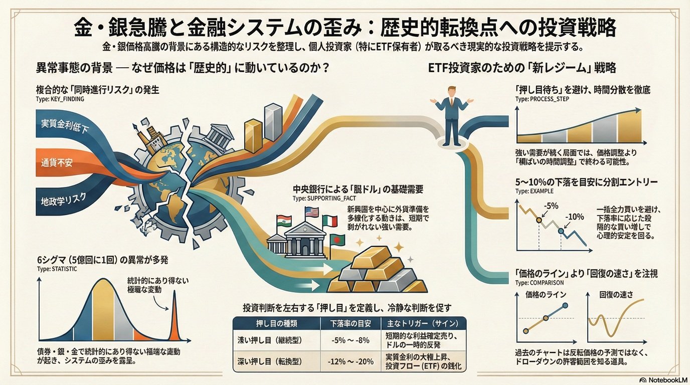 これは、従来の金融モデルが前提としてきた「正規分布」の世界が終わり、資産間の相関が予測不能な形で変化する「テールリスクの常態化」時代に突入した可能性を意味します。金の値動きは金だけの問題ではなく、世界の金融システムを支えてきたゲームのルールそのものが変化し始めている「パラダイム転換」の予兆なのです。