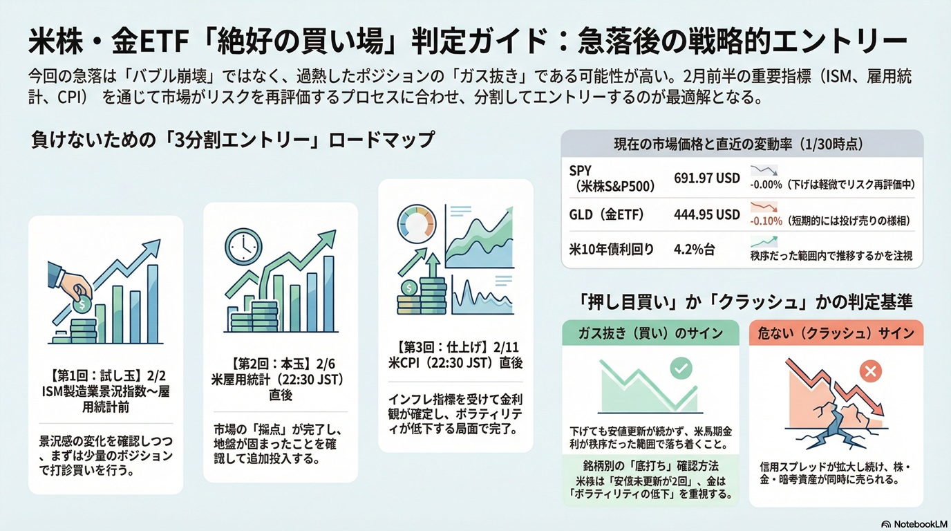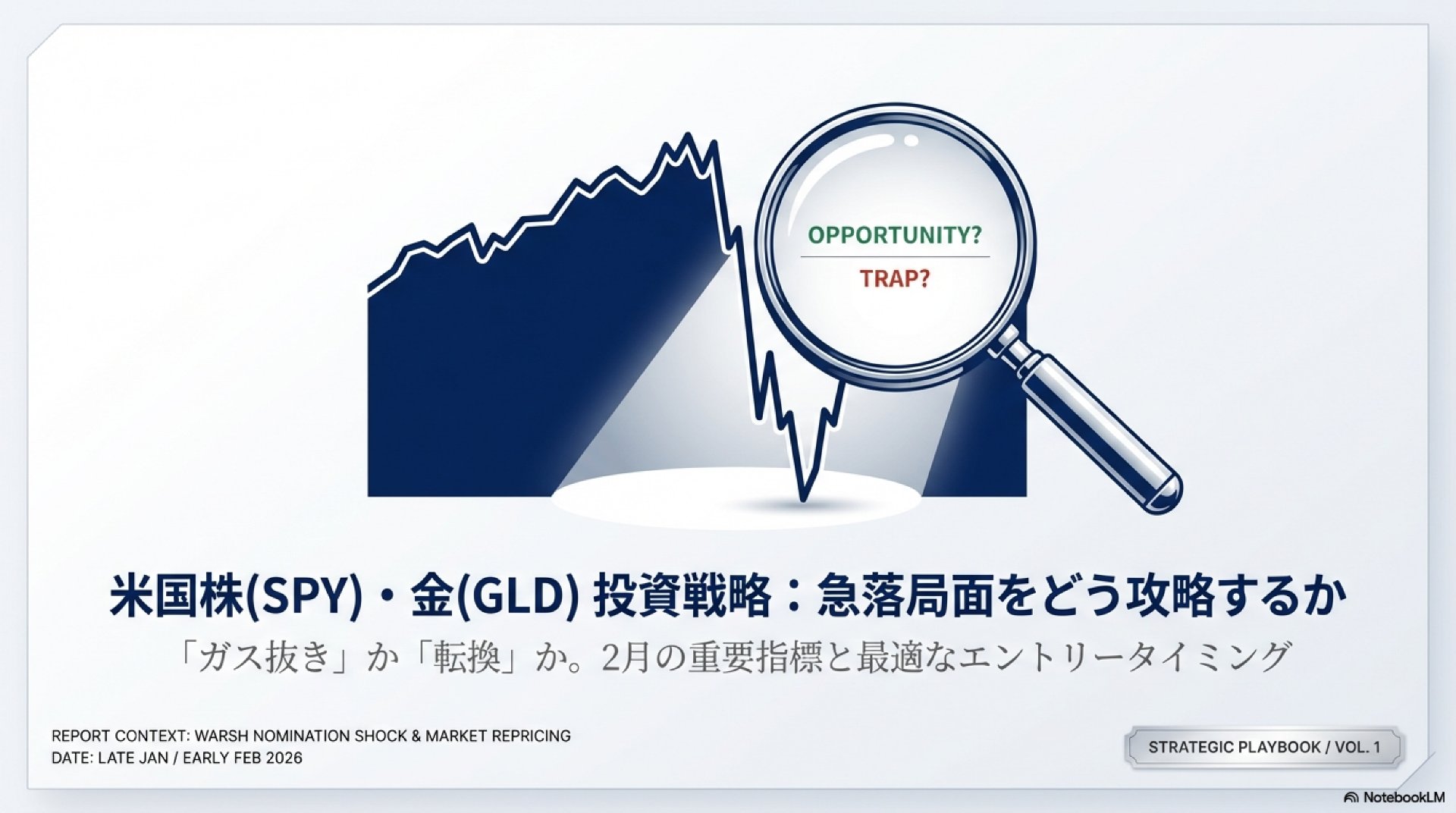 米国株(SPY)と金(GLD)では、今回の下落の背景と性質が根本的に異なります。SPYの下げは「リスクの再評価」であり致命傷ではないのに対し、GLDの急落は金先物が過去最大級の下げを記録したことからも分かる通り、「ポジション解消(投げ・マージン)」の匂いが強いものです。この質的な違いを踏まえ、それぞれに最適化した戦術を立てます。