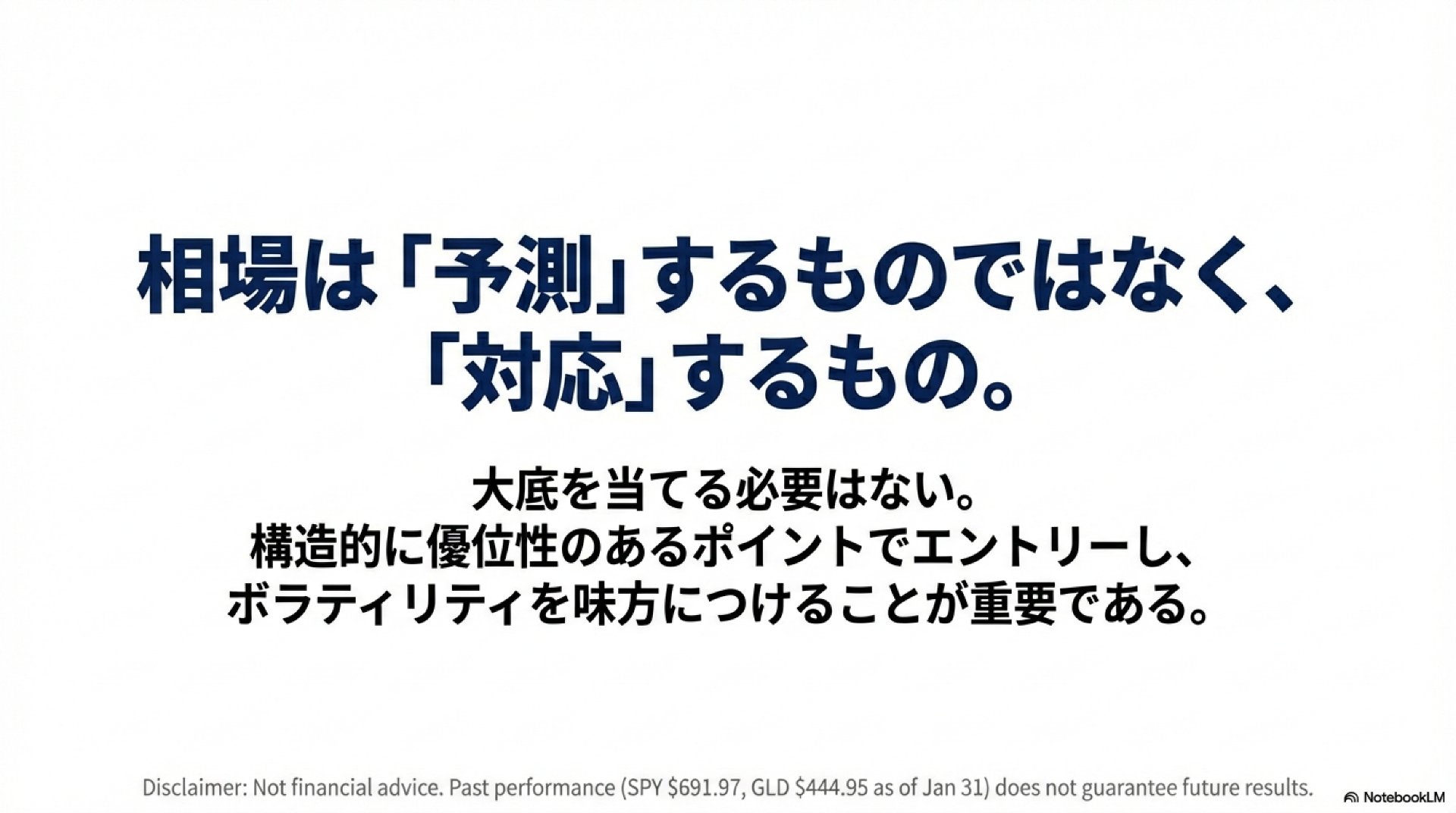 - 資産の特性(SPYのリスク再評価 vs GLDのポジション解消)に応じた戦術を使い分けること。
