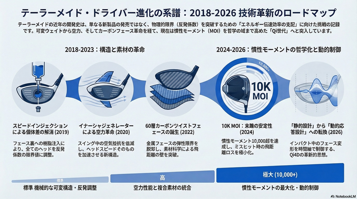 2018年のMシリーズから、未だベールに包まれた2026年の「Qi4D」まで。この8年間の軌跡は、ドライバーが単なる「打つための杖」から、物理現象をミリ秒単位でハックする「運動制御装置」へと変貌を遂げるプロセスそのものです。技術ジャーナリストの視点から、その驚くべきロードマップを解き明かします。
