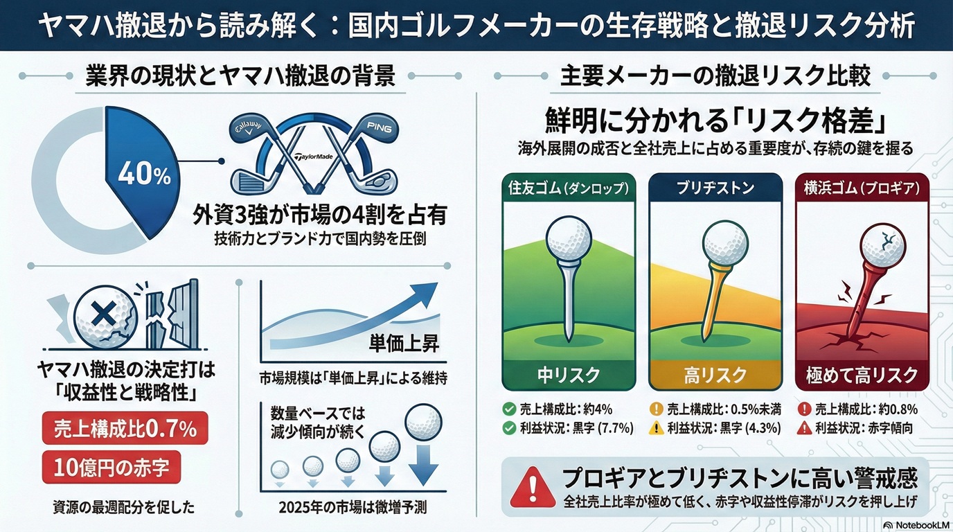 ヤマハのゴルフ事業撤退は、国内ゴルフ用品業界にとって「他人事ではない」現実を突きつけた。市場縮小、競争激化、原材料費高騰、為替変動など、撤退リスクは今後も高まる。特に、ゴルフ専業ではない総合メーカーにとっては、全社戦略との整合性や資本効率の観点から、事業の選択と集中、撤退・縮小の判断が避けられない局面にある。