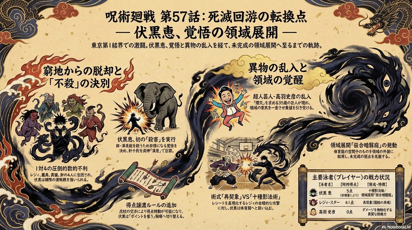 これまで積み上げられてきたシリアスなデスゲームの文脈が、一人の芸人によって上書きされ、一方で主人公の一人である伏黒恵が「術師としての完成」に向けて不可逆的な決断を下す。この混沌とした4つの衝撃ポイントを、現代文化と呪術のメタファーという観点から深く掘り下げていきましょう。