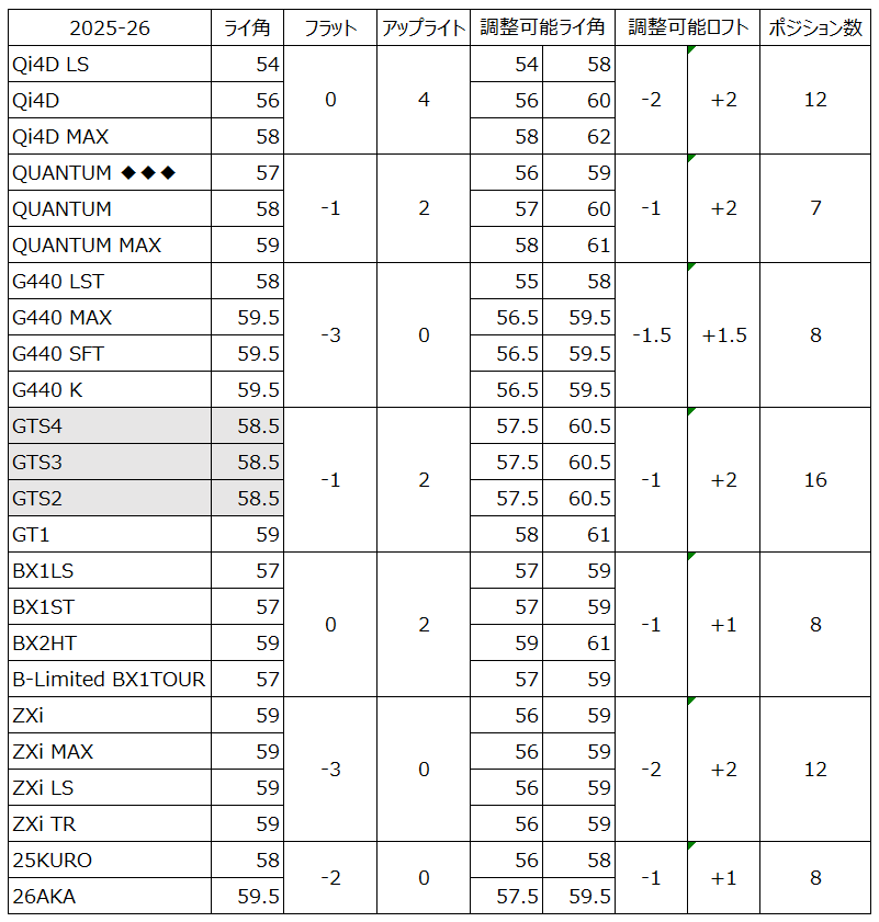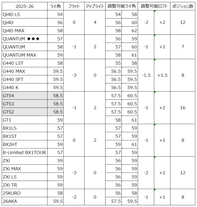 試打でよく比較されるQi4DとQUANTUMとG440 MAXですが、それぞれライ角が違います。Qi4Dは56度、QUANTUMは58度、G440 MAXは59.5度です。この3つのモデルではピンのG440 MAXが一番つかまりがいいです。しかも、慣性モーメントも大きいので曲がりにくいです。