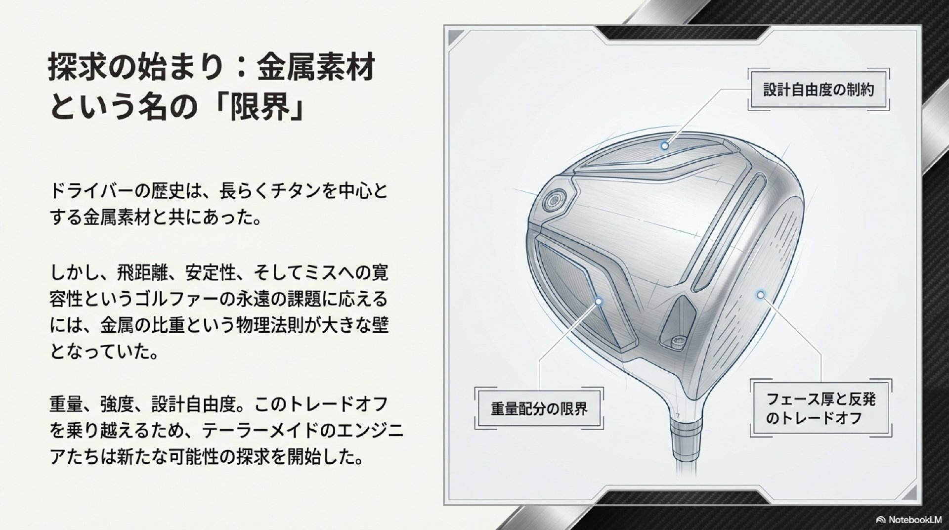 テーラーメイドの技術進化は、「重い金属の鎧を脱ぎ捨て、カーボンという軽くて強い翼を手に入れた航空機」の歴史に例えられます。機体(ヘッド)を軽くして自由な設計を可能にし、さらには操縦士(ゴルファー)のスイングに合わせて翼(シャフト)を最適化することで、誰もが速く、安定して遠くへ飛べる時代を切り拓いてきたと言えます。