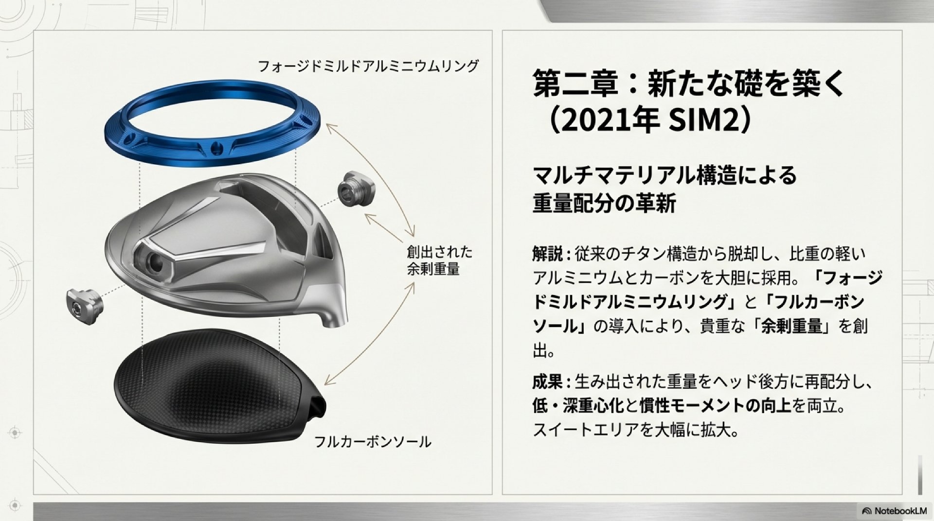 『SIM2』シリーズは、従来のチタンに代わり、比重の軽いアルミニウムを用いた「フォージドミルドアルミニウムリング」と「フルカーボンソール」を導入しました。これにより生み出された余剰重量をヘッド後方のウェイトに配分することで、低・深重心化と慣性モーメントの向上を両立し、スイートエリアを大幅に拡大させました。