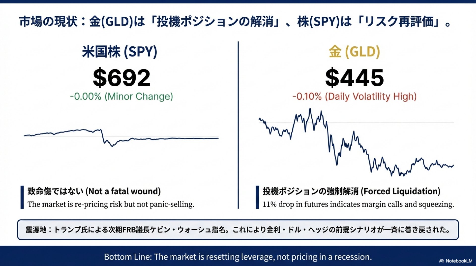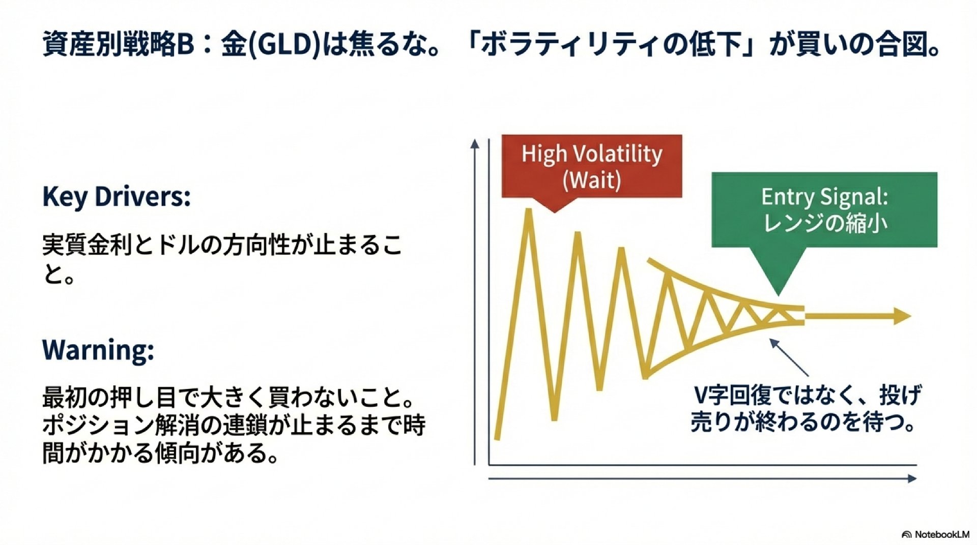 米国株(SPY)と金(GLD)では、今回の下落の背景と性質が根本的に異なります。SPYの下げは「リスクの再評価」であり致命傷ではないのに対し、GLDの急落は金先物が過去最大級の下げを記録したことからも分かる通り、「ポジション解消(投げ・マージン)」の匂いが強いものです。この質的な違いを踏まえ、それぞれに最適化した戦術を立てます。