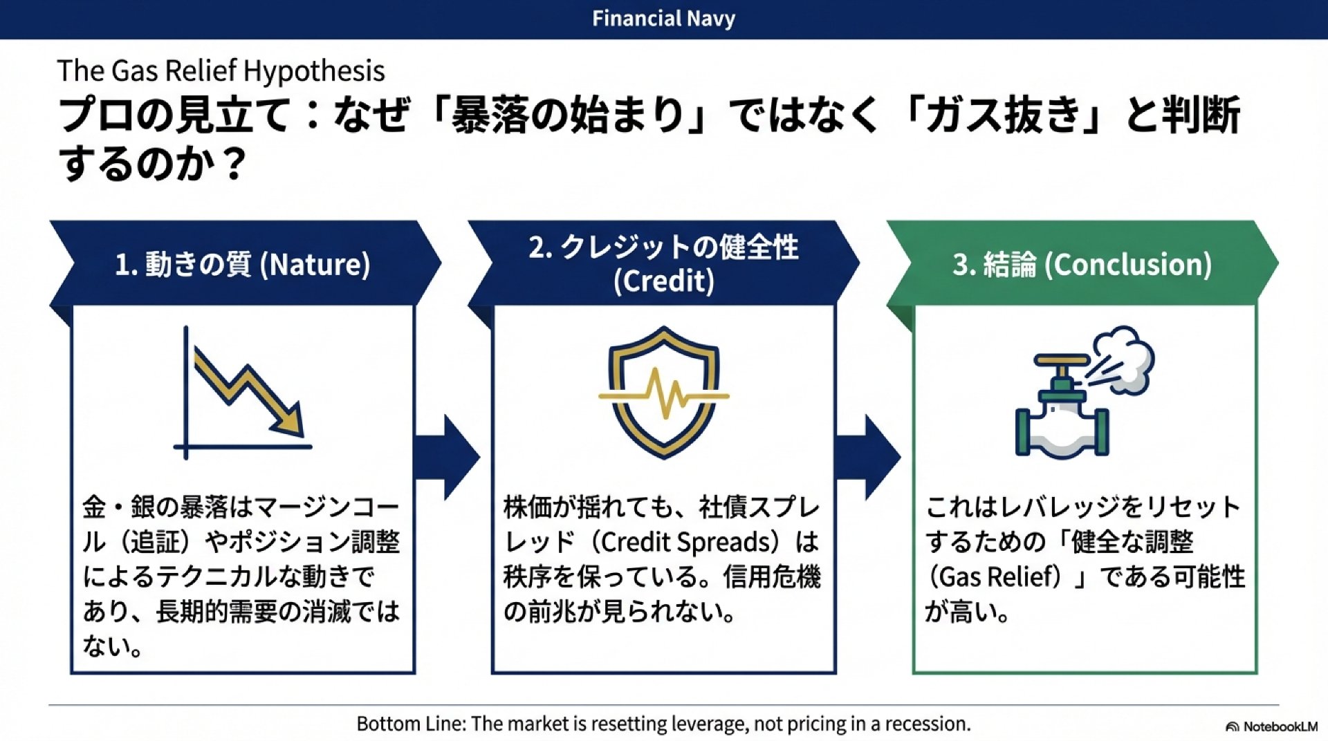 本稿の中心的な仮説は、この変動が「バブル崩壊の初動」ではなく、過熱していたポジションの偏りが一気に解消される健全な「ガス抜き」であるというものです。この調整局面は、適切に対応すれば絶好の投資機会となり得ます。