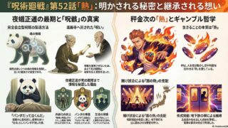 『呪術廻戦』第52話「熱」の衝撃:単なるネタバレではない、物語の核心を突く4つの発見『呪術廻戦』第3期52話「熱」は、単なる物語の進行に留まらない、シリーズの根幹を揺るがすエピソードでした。この回は、二つの重要な軸「想いの継承」と「異端との...