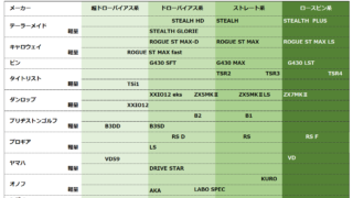 Golf 2023年版 メーカー別ゴルフクラブポジショニングマップ(アイアン編) ドライバーのポジショニングマップを作ったので今度はアイアンのポジショニングマップを作ってみました。アイアンのポジショニングマップは操作性(上級者向け)から寛容性(アベレージゴルファーやオートマチックなスウィング)で分けてみました。また、素材... 2023.09.13 Golf