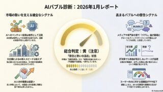 AI AIバブル診断 2026年1月2日時点 12月のAIバブル状況は以下の通りです。状況的には「5) 社会・世論」だけが悪化しているだけで、ほかは注意にとどまっています。確かに、多くの企業が設備投資や巨額の資金提供などニュースを見ると「これはやばいんじゃないか」と思ってしまいますが、... 2026.01.03 AI